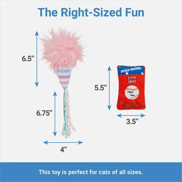 Turn that sneak attack into a snack attack! This two-pack of quality plush cat toys includes the materials and textures cats prefer for playtime, with cotton candy with curly strings to bat at and a Kitty Jacks snack pack. Each toy is stuffed with catnip and crinkle paper to help fuel your cat for an epic playtime session. Your kitty will want to get their mitts on this! Frisco by Chewy has you covered with all the essentials for a happy pet, from poop bags to litter, apparel, toys, beds, dinnerware, leashes and collars and lots more.