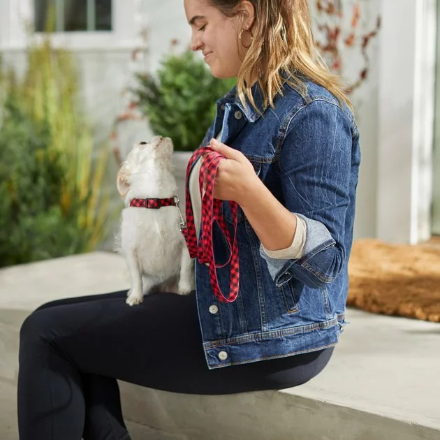 This stylish leash is made with red and black buffalo check-patterned polyester webbing that’s great for everyday walks with your furry friend. Whether you’re just out for a walk or taking in some nature with your fashionable fur friend, this leash will keep your pup close and stylish. The easy-to-use bolt snap securely attaches to any collar or harness, and it’s nickel-coated for a sleek, polished look. Staying in control throughout your walks will feel effortless with the nifty loop handle. Complete the look with a matching collar!