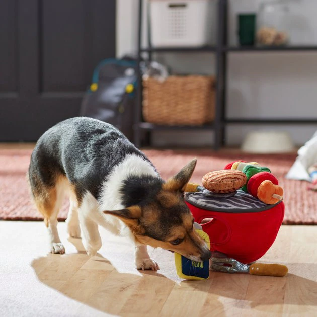 - Grilling and squeaking! Plush puzzle toy includes grill base and squeaky grilling accoutrements, with squeakers and crinkle paper inside.