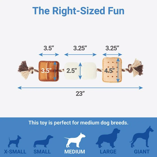 - Camping s’mores plush toy has squeakers and rope to turn up the fun.