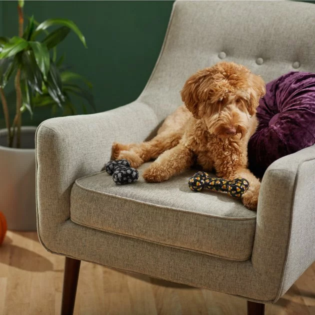 Some toys go squeak in the night…these toys go squeak all the time! These classic ghost and candy corn-patterned toys keep your furball in the spooky spirit year round. The bone-shaped design is made from quality thermoplastic rubber for a squishy bite and erratic bounce that keeps every game of fetch and catch fresh and fun! They’re made with built-in squeakers, too, so it’s great for ghouly games and squeaky, solo fun your dog will adore! Plus, the colors and pattern add a bit of much-needed Halloween color to your dog’s toy collection. Frisco by Chewy has you covered with all the essentials for a happy pet, from poop bags to litter, apparel, toys, beds, dinnerware, leashes and collars and lots more.