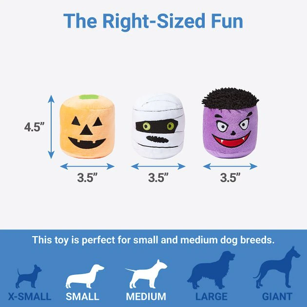 Trick or treat? Why not both? This crew of cubed cuties makes a fun addition to your dog’s toy box! It comes with cube-shaped toys—a mummy, a vampire and a jack-o-lantern. They’re covered with soft fabric and plush-stuffed so they’re easy to catch and carry, and each one has a squeaker inside to keep your pup focused on the fun. Catch, fetch or cuddle—this gang of ghoulie friends is up for it however your dog plays!