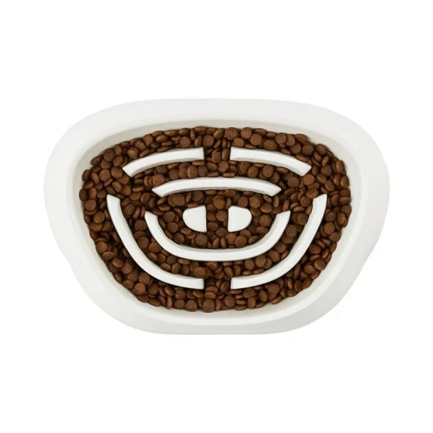 - Lengthen mealtime with this slow feeder. Puzzle-like ridges break up eating surface so dogs have to slow down to eat, and slanted bowl angle for a more comfortable eating position.