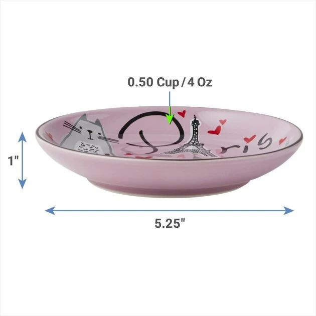 - Soft purple ceramic cat dish with a distinctive Paris-themed design inside.