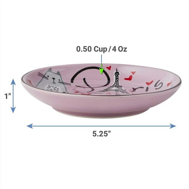 - The Frisco Paris Non-skid Ceramic Cat Dish is crafted with a distinctive Paris-themed design outside and “kiss me” graphic inside.