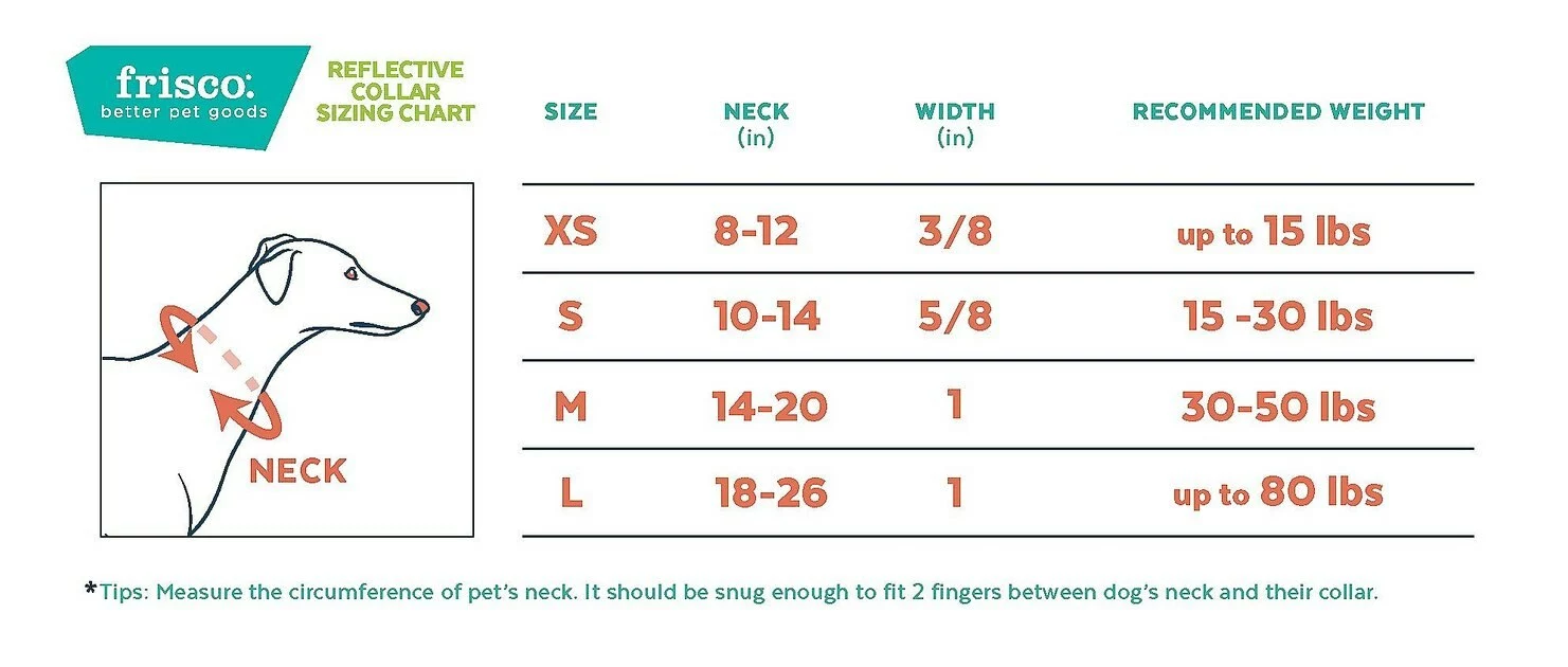 The Frisco Patterned Polyester Reflective Dog Collar collection feature stylish, reflective patterns to make sure your pooch is the hippest pup on the block, day or night. The reflective patterns aren’t just fashion- paw-ward, but are designed to reflect ambient light for added safety in low-light conditions. Nighttime outings? Check. These collars are built to brighten up any walk—literally—by reflecting light from the environment. And they’re made to last with high-quality, polyester webbing that uses an Ultra-Weld™ seal that’s been lab-tested to withstand up to seven times the maximum recommended weight for each size. This collar also features sleek, nickel-coated hardware, and the plastic buckle has curved edges for your dog’s comfort. Most sizes also feature an ID ring for attaching ID tags without cluttering the collar. Plus, there’s a matching Frisco Reflective Leash that goes with each collar style!