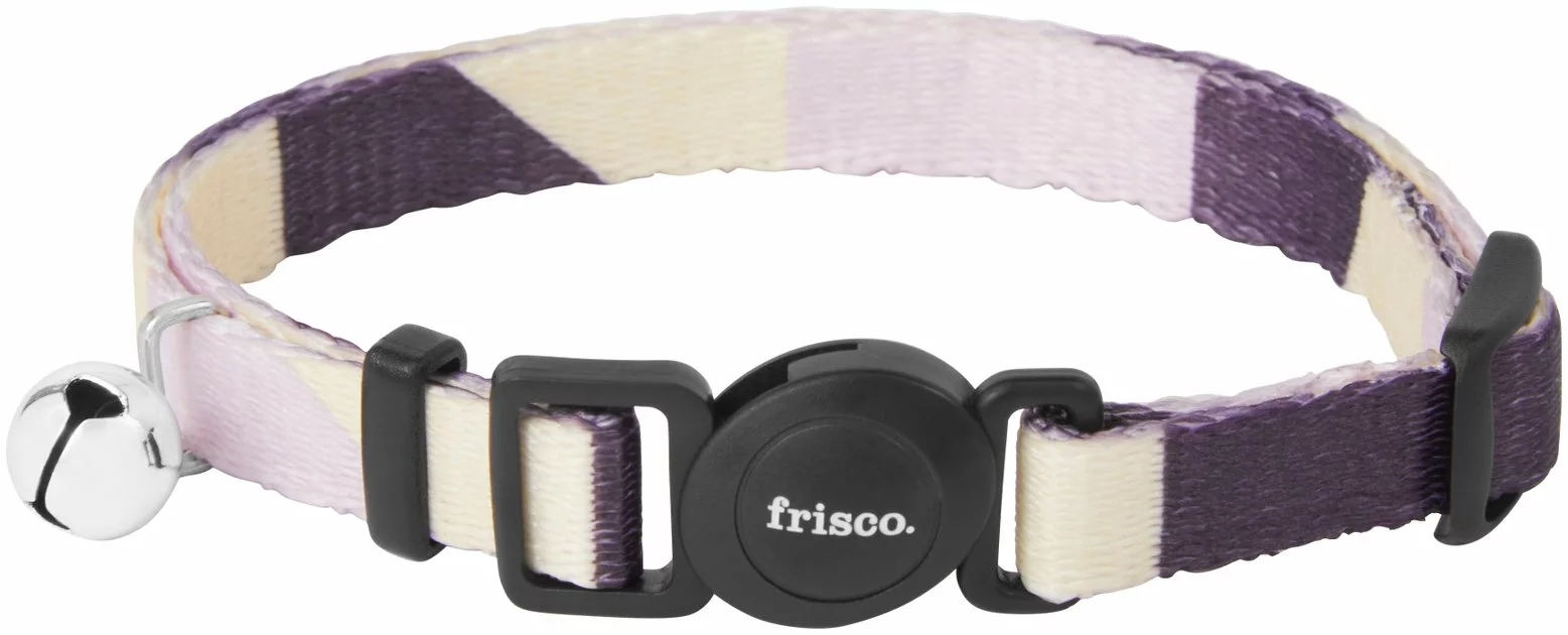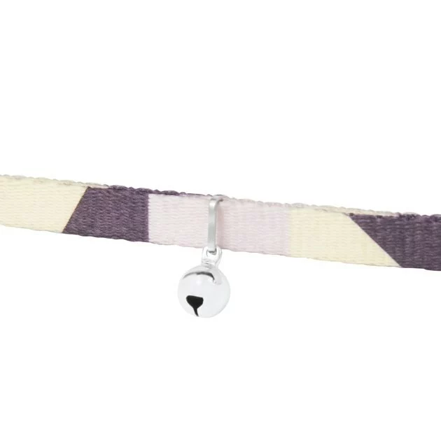 - Purple-and-cream colorblock cat collar made with high-quality polyester webbing that’s perfect for everyday use, indoor or outdoor. For cats 8 lbs. and over.