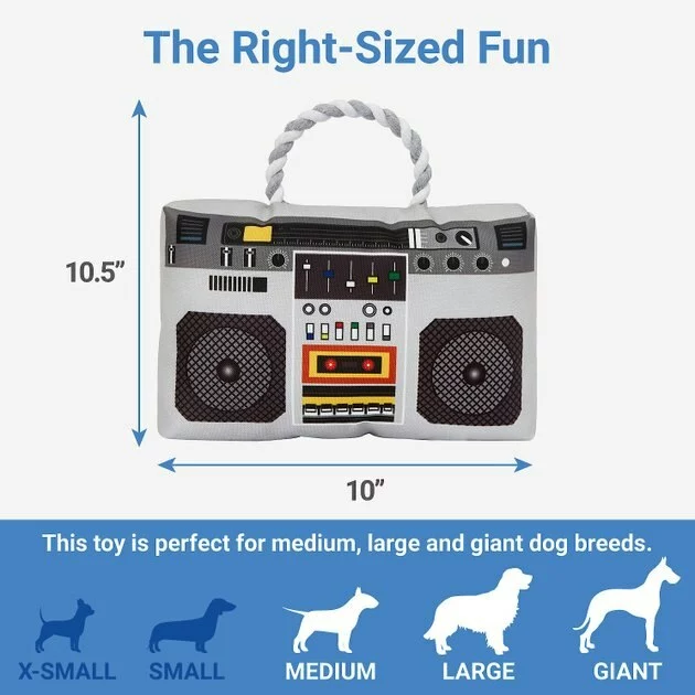 This squeaky boombox dog toy is your dog’s new jam! Turn up the fun with this stuffed, ballistic nylon toy your dog will love to chomp on, chase and carry around. It’s got two squeakers inside—that’s one for each speaker—that keep them listening and the throwback style just can’t be beat if you’re looking to add a little retro flair to your dog’s toy box.