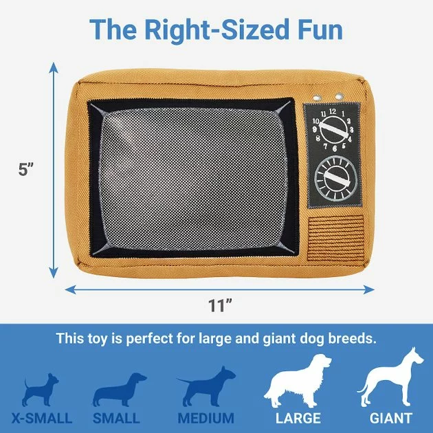 - Retro wood-paneled TV dog toy adds some nostalgic cuteness to your dog’s toy collection.