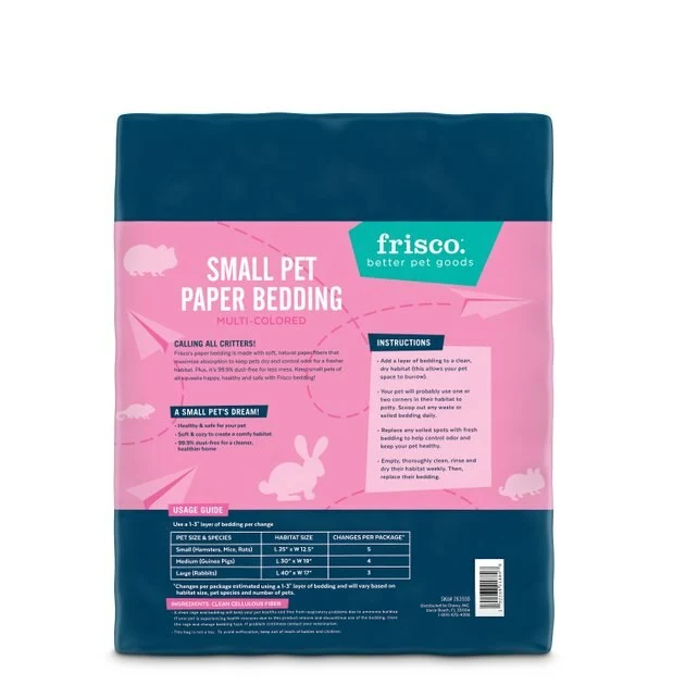 Provide a comfortable, inviting habitat for your small pet with Frisco Small Animal Bedding. This pillowy soft bedding is made from paper that’s safe for your little friend and 99.9% dust-free—that means a happier pet and a cleaner home too! This bedding absorbs up to six times its weight and expands up to three times its size, which helps keep their place dry and clean. Plus, it’s available in clean white, natural brown or bright multi-color so you can pick the look that’s right for you and your pet.