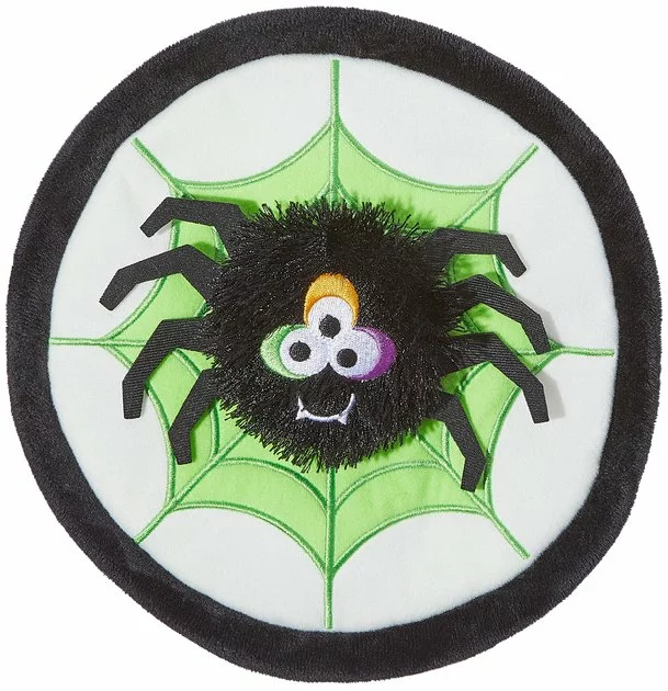 - Plush, squeaky spider web toy includes a flat spider web base and a detachable spider.