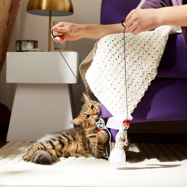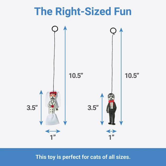 These bouncy buddies bring twice the Halloween action to your cat’s play sessions! This two-pack includes a Day of the Dead-themed bride and groom, each attached to a springy string with a finger loop at the end. Just put your finger through the loop and do a little puppet show for your feline friend. They’ll be bouncing and pouncing in no time. There’s no better way to bring out your cat’s inner hunter than bouncy skeleton toys like these, no bones about it!
