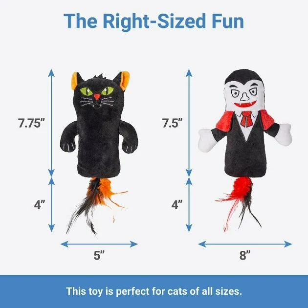 - Includes a spooky black cat toy and a classic vampire toy, each with feathers attached.